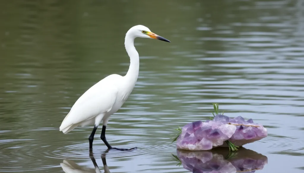A garça branca ensina a inteligência da pausa, demonstrando a importância de observar e sentir o momento certo antes de qualquer ação. - Como a ametista pode auxiliar no dia a dia?