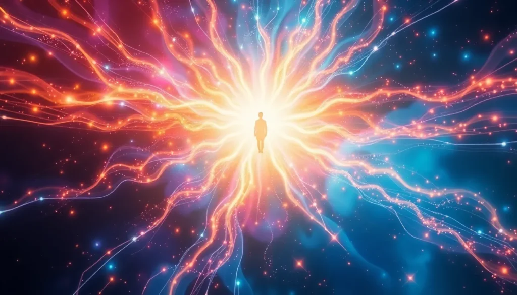 Sinta a luz crescendo e se expandindo, conectando milhares de luzes, uma explosão luminosa de amor que toca o mundo e ilumina o coração de todos os seres, atravessando as gerações do tempo e da eternidade.