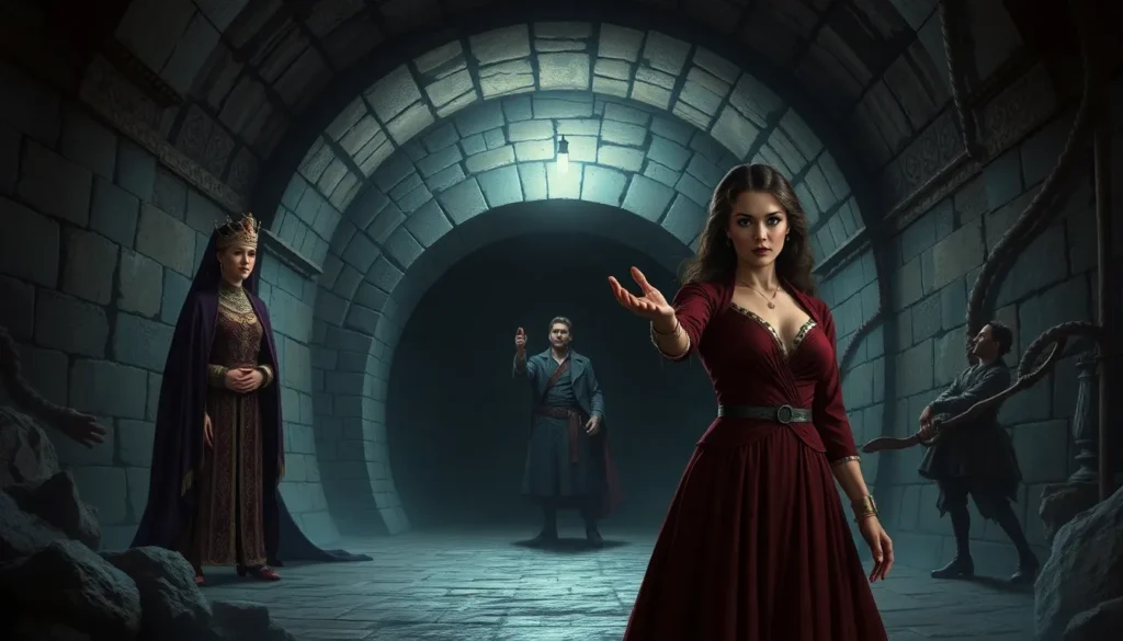 A situação toma um rumo inesperado quando uma voz se dirige a alguém com a saudação: “Sua Majestade, eu o peguei.” Um terceiro personagem, claramente surpreso e fora de controle, reage: “Quema, quema, espere um pouco aqui. O que exatamente está acontecendo aqui? Quem é você? Espere. Deixe isso de lado. Eu não me importo. Como saímos daqui? Qual o caminho para a Floresta do Sul?”